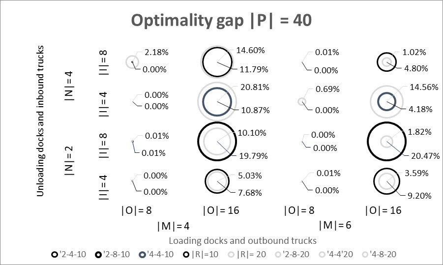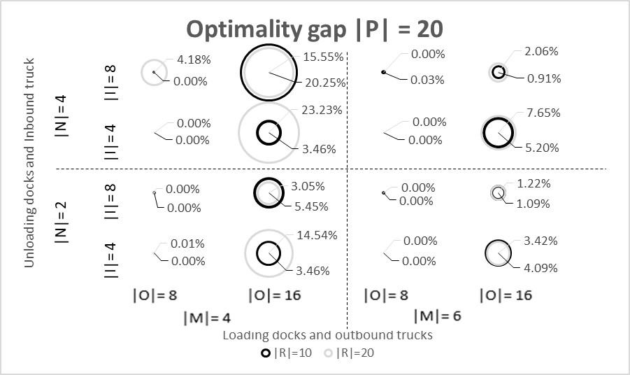 Hereafter, we analyze the behavior of the optimality gap according to the characteristics of the problem. Figures 4 and 5 present the optimality gap for |P|=20 and |P|=40, respectively. In both figures, the X axis presents the loading docks and the outbound trucks; the Y axis presents the loading docks and the inbound trucks. The gray and black colored circles represent the problems with |R|=10 and |R|=20, respectively. The size of the circles represents the value of the optimality gap.