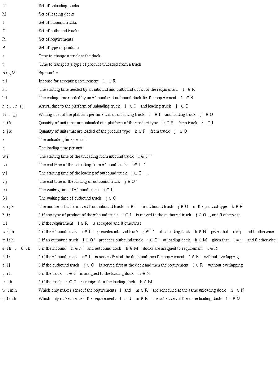 As an alternative to avoid the overlap, we use in our model the following decision variables: variable is equal to 1 if the inbound truck is assigned to the unloading dock , and 0 otherwise. Variable is equal to 1 if the outbound truck is assigned to the unloading dock , and 0 otherwise. Although those variables can be seen as a subset of the variables and , the motivation to include them is to facilitate the building of the overlapping constraints. In the case that the truck and a requirement are assigned to the same dock, the variable is equal to 1 if the inbound truck is served first at the dock and then the requirement without overlapping, otherwise, is equal to 0 if the requirement is served first at the dock and then the inbound truck without overlapping. It is important to notice that this variable makes sense only when the requirement and the inbound truck are scheduled at the same dock. It means when and take the value of 1. If or are 0, the value of can be neglected. Similarly, the variable functions the binary variable , but in this case, it is defined for the outbound truck . Considering that overlapping between requirements is a possibility, we introduced the binary variable , which only makes sense if the requirements and are scheduled at the same unloading dock . This variable takes a value of 1 if the requirement is served first and then the requirement , and it will be 0 if the requirement is served first and then the requirement . Finally, the binary variable is defined for the loading dock in a similar way to the previous variable. Considering the quantity of sets, parameters and variables, Table 1 summarizes the notation of this problem.