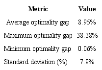 Table 4 shows the results for the instances that did not find an optimal solution (63/128). As seen in Table 4, the average optimality gap is 8.95%, the maximum gap is 38%, the minimum gap is 0.06%, and the standard deviation is 7.9%. Analyzing the results in detail, we found that 25 of the instances wherein an optimal solution was not reached have a gap lesser than 5%. Despite not finding the optimal solution in these instances, the behavior of the gap is acceptable for the problem at hand.