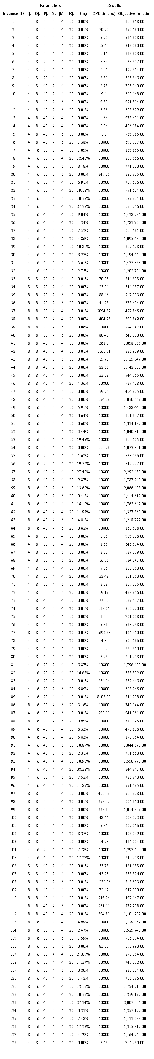 Table A1 presents the detailed results for the computational experiment from the MILP formulation. Column 1 presents a consecutive number for each of the instances, columns 2 – 7 present the parameters for the generated instances, column 8 shows the optimality gap, column 9 presents the CPU time, and column 10 presents the objective function value.