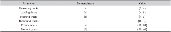 We generated a set of 128 instances inspired by the real operation or a retail company. Aiming to obtain different size instances, we generated instances with different amounts of unloading |N| and loading |M| docks, inbound |I| and outbound |O| trucks, requirements |R|, and product types |P|. Table 2 contains the values of the parameters used in the generation of the instances. The magnitude of the used parameters is based on the information from the real operation. Using these values, we obtained 64 combinations. From each combination, we generated 2 instances; hence, obtaining 128 instances. The magnitudes of arrival time of the trucks, vehicle change time, moving time between loading and unloading docks, loading and unloading rate, and the amount of units per product were randomly generated using magnitudes from the real operation.