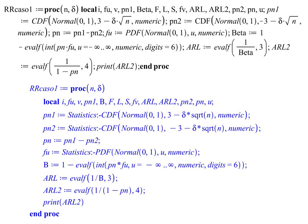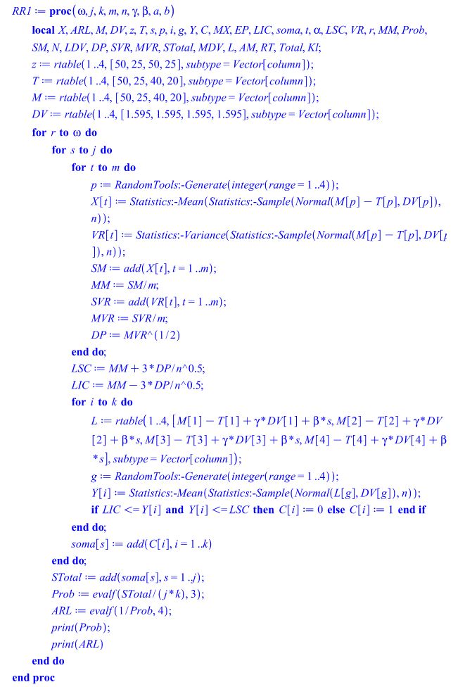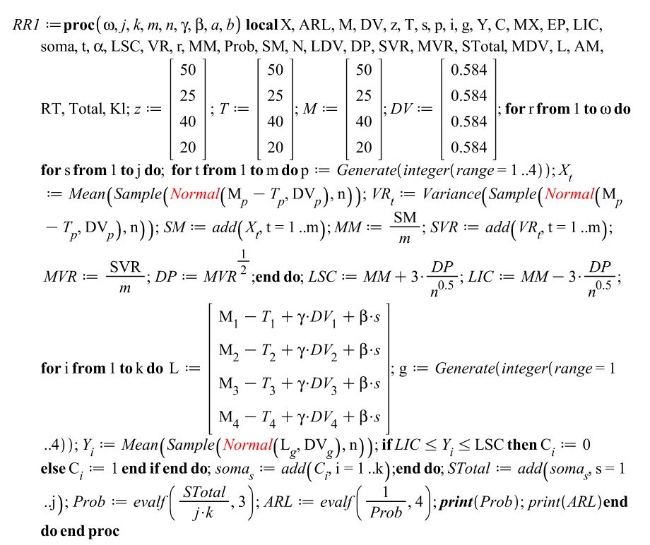 To simulate the use of the nominal deviation control chart in any production process and analyze its performance, mathematical models were developed in the Maple 2016 software. The first model was created to calculate the ARL of the control chart built with known parameters, or KK chart, seen in Appendix 1. The chart's ARL is calculated in the same way as the mean chart, as both are based on a Normal probability distribution.