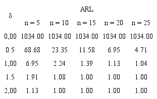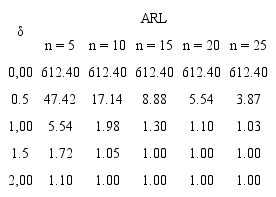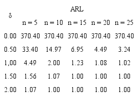 To calculate the ARL of the KK chart, the displacement between means δ was considered, ranging from 0 to 2. Table 1 shows the ARL of the graph calculated for n, varying in 5, 10, 15, 20 and 25 observations.