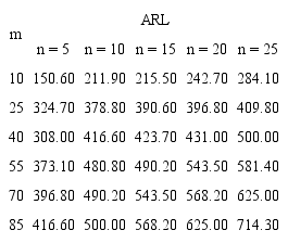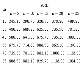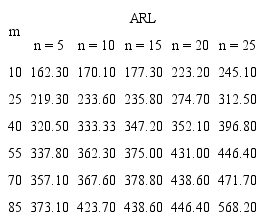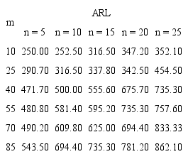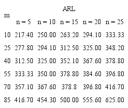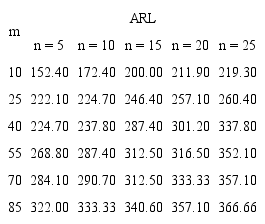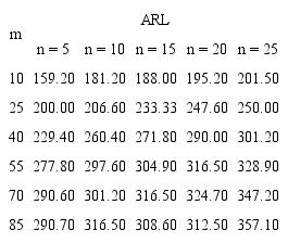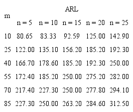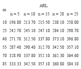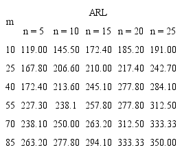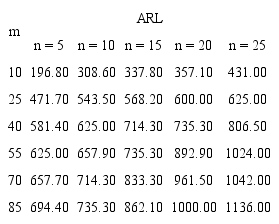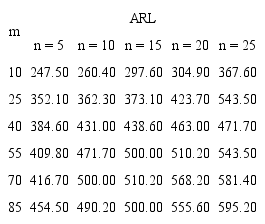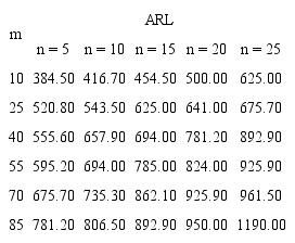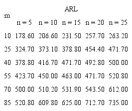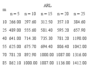 Note that the mean ARL of the control chart is greater for a greater number of observations. For example, for m = 70 and n = 25, the ARL on the chart is 364.60, close to 370.40. Small subgroups with smaller sample sizes have a smaller ARL compared to the ARL of the ideal control chart.