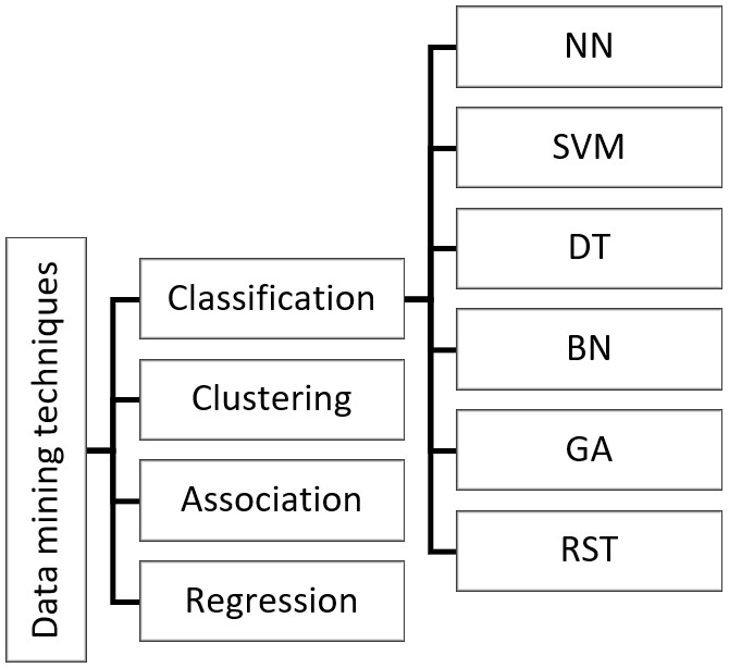 Several approaches to the categorization of Data mining algorithms are available. The approach used in this study identifies strongly with Patel & Patel (2014), although, for our purpose, the methodology was slightly modified. The scheme in Figure 1 represents a description of our approach. Data mining techniques can be roughly categorized into four major groups, namely Classification, Clustering, Association, and Regression. Classification is a process of determining groups (“classes”) of given objects based on their characteristics, where the semantics of these classes is known beforehand. Classification and prediction are two forms of data analysis that can be used to extract models describing important data classes. Classification methods predict the target class from analyzing the training dataset. To maximize predictive accuracy, the testing phase is then performed. In our work, this set of methods contains Neural networks (NN), Support vector machines (SVM), Decision trees (DT), Bayes networks (BN), Genetic algorithms (GA), and Rough set theory (RST). Clustering is the process of identifying natural groupings or clusters within multidimensional data based on some similarity measure. A brief characterization of the most popular DM tools, suitable also for manufacturing process analyses, can be found in Perzyk et al. (2007) or Perzyk (2006).