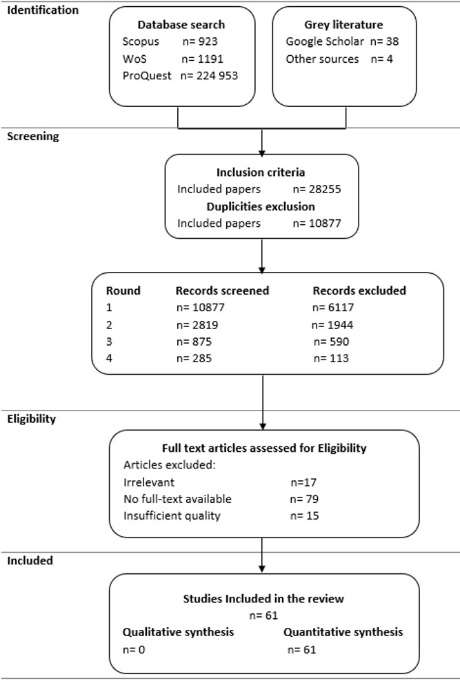 A total of 28255 articles met the inclusion criteria. After the removal of duplicities, we got the total number of 10877 papers which will be subject to the screening process itself. In the next part of the screening process, the 4-round exclusion process is used to reduce the source set of papers. The reduction process of the original set of papers is demonstrated in the PRISMA flow diagram (see Figure 3).