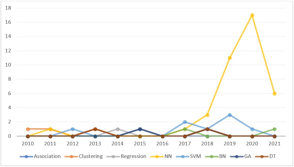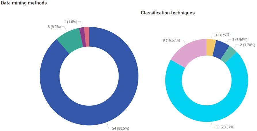Recently it has become more common for authors to try to combine different data mining methods and use them parallelly or sequentially. In our primary set of articles, we deduced that approximately 30% of gathered articles use more than one DM method. We noticed that SVM is often combined with other methods, such as Genetic algorithms, Decision trees, or Neural networks. On the other hand, we can say that generally, the NN method is not used in combination with other different methods, but sometimes various NN types are combined together.