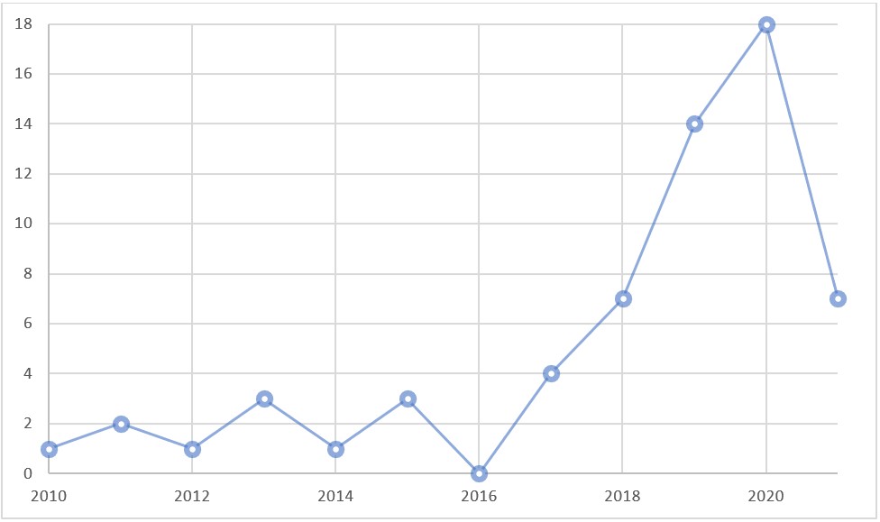 The number of papers from our set of articles distributed over the years is shown in Figure 5. We can see that from 2017 the number of published articles focused on DM methods application in defect detection and classification has significantly increased. So far, the highest number of studies was published in 2020, but the number of studies for 2021 is taken only for the first quarter. From this, we can assume that our research topic is currently often discussed among researchers from around the world. Figure 6 then shows the particular DM methods usability distributed over the years. We can see that the Neural network method is the most frequently used, especially in recent years (total of 17 studies in 2020). There is also growth for the SVM method from the year 2017 (with 2 applications in 2017 and 3 in 2019). From the chart, we can also assume that BN method usability will increase in the near future. On the other hand, Regression and Clustering methods are probably already behind the zenith and are no more perspectives for us.