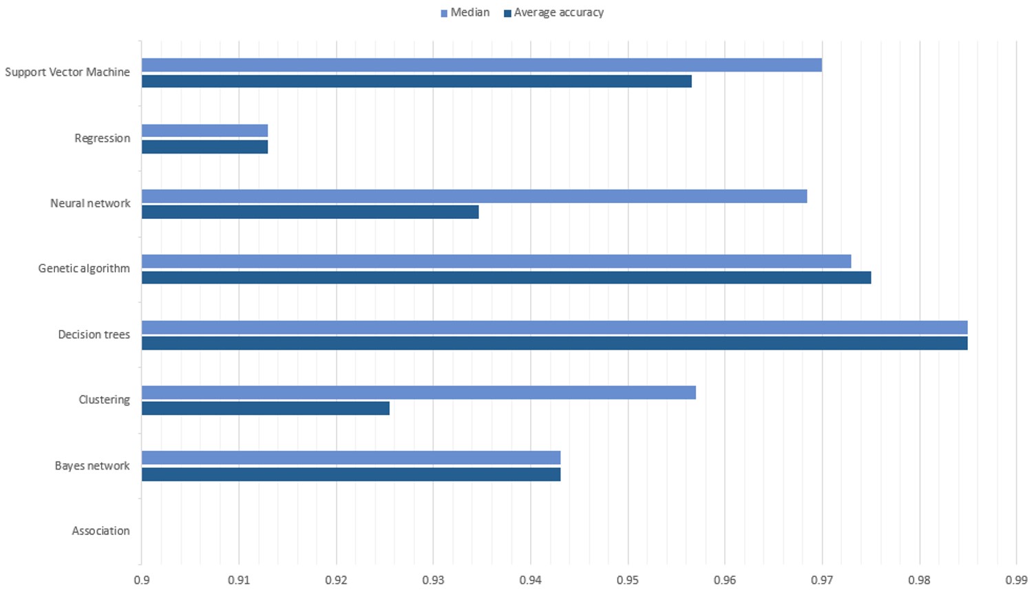 The DM method efficiency can be measured, for example, by F-measure, AOC, or simple accuracy. We have compared the particular DM methods by average accuracy achieved by the proposed method. As you can see from Figure 7, the highest average accuracy was achieved by Decision trees, Genetic algorithms, and SVM methods. During the analysis of individual primary studies, we observed that NN, as well as SVM, have achieved in some cases even 100% accuracy, but due to the high volume of studies implementing in the case of NN, the final result can be distorted. For this purpose, we decided to add a median that is less sensitive to extreme values. So from the median point of view, we can see that accuracy of NN, SVM, and Clustering methods is significantly higher.