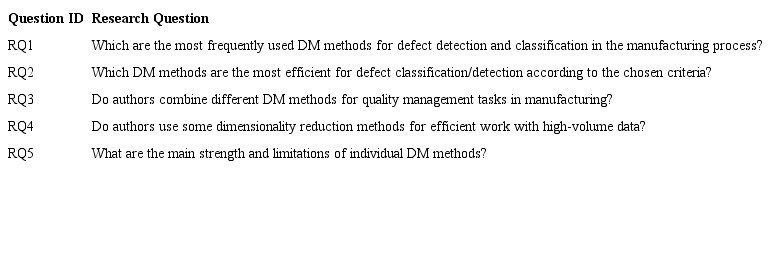 Paper aims: This research aims to analyze the primary studies published in recent years focusing on defect detection or classification in manufacturing and extract information about frequently used data mining (DM) methods, their accuracy, strengths, and limitations.