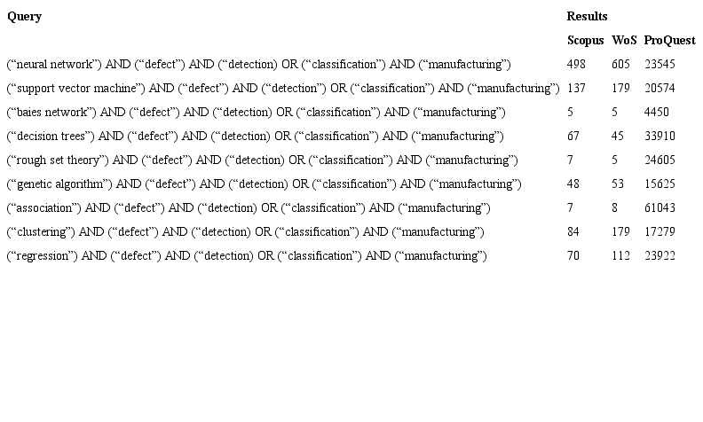 The search for our systematic review was performed in March 2021. Data synthesis is used to collect and summarize the data extracted from primary studies. Moreover, the main goal is to understand, analyze and extract frequently used DM methods for defect detection and classification applications in manufacturing processes. We analyzed the extracted data to determine the trends and collect information about our research questions. In addition, we classified and analyzed articles according to the research questions proposed in Section 3.1. We also classified the literature according to different research questions. The most important task was to classify the articles according to the DM methods through the relevant analysis.