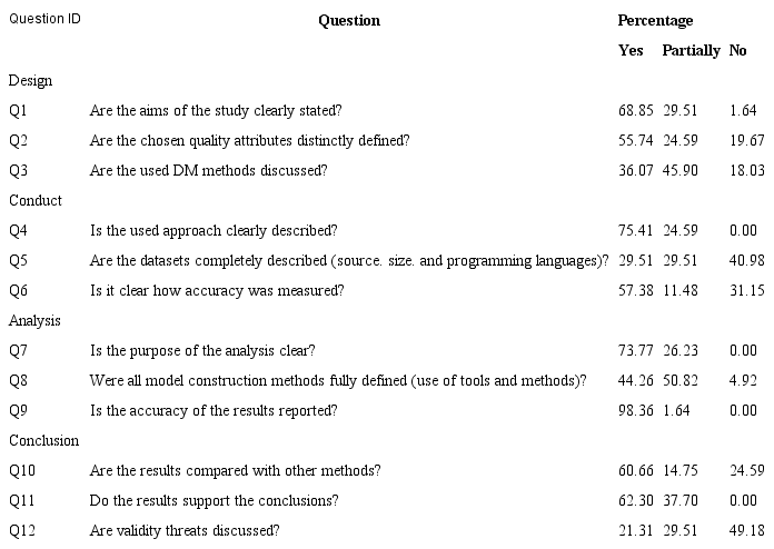 In the quality assessment phase, the articles are evaluated according to the different points of view. The crucial aspects are clarity in research aims, methodology, and also results in description and discussion. The criteria for the quality of the study were determined according to the guidelines proposed by Kitchenham & Charters (2007). The corresponding quality checklist is shown in Table 5. The table includes 12 questions that consider four research quality dimensions, including research design, conduct, analysis, and conclusions. For each quality item, we set a value of 1 if the authors put forward an explicit description, then a value of 0.5 if there was a vague description, and value 0 if there was no description at all. Each possible answer for each question has been scored in the main article and converted into a percentage.