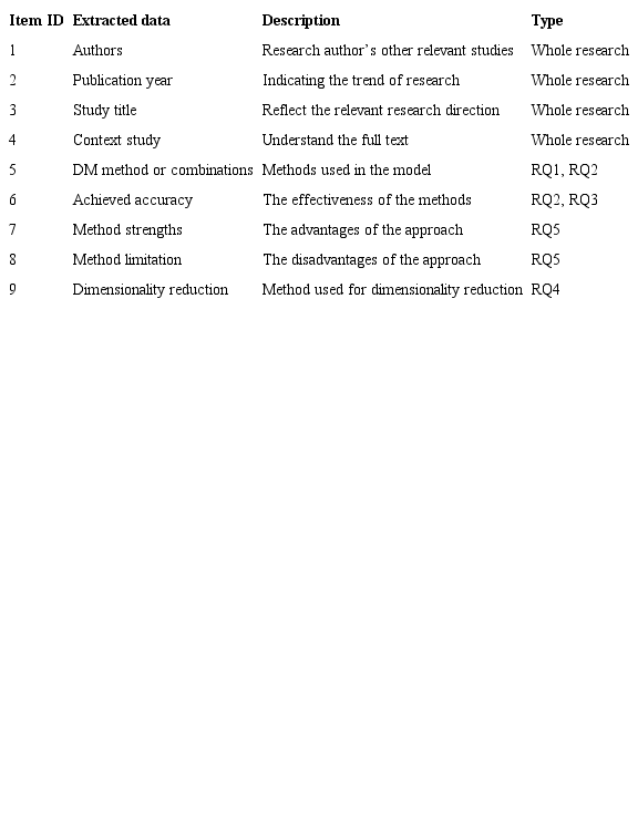 The goal of this step is to design forms to identify and collect useful and relevant information from the selected primary studies so that they can answer our research questions proposed in Section 3.1. Table 6 shows the data extraction form, which will be applied to all selected primary studies for the purpose of detailed analysis.