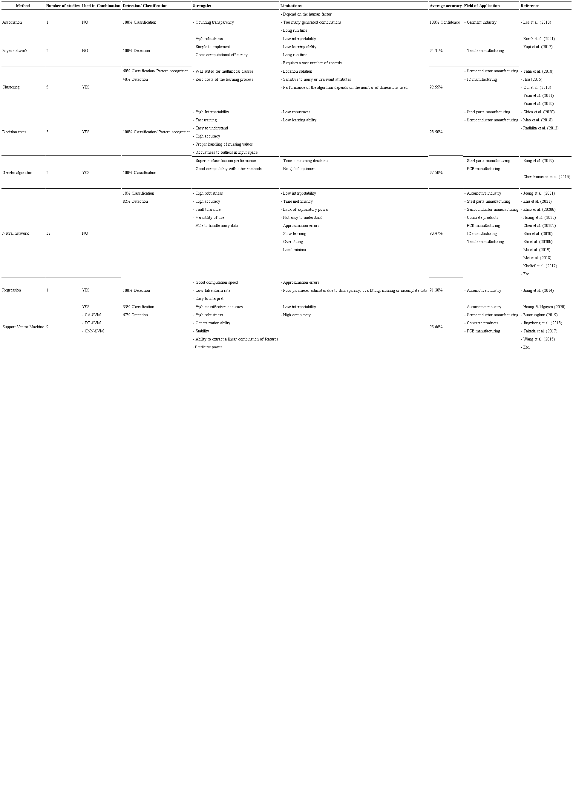 Implications for theory and practice: This study contributes to the quality management literature by extending a summary of recently used DM methods for defect detection and classification. This summary can help researchers choose a suitable method and build models for achieving its research purpose.