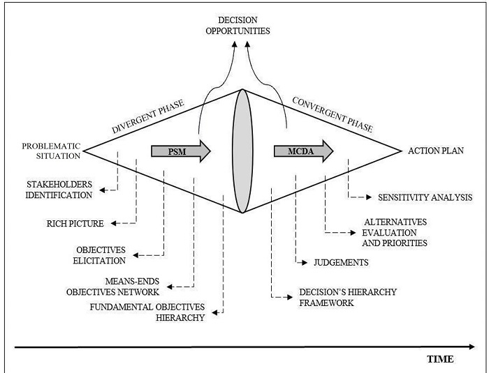 Belton & Stewart (2002) present a way of using PSM to structure the problem before specifying alternatives, defining criteria, and eliciting values, because the problem is not "given" for being tackled, it is a messy situation. Figure 1 illustrates two phases of the designed decision support process. Initially, a divergent phase – data collection during the problem structuring – is used to capture the situation complexity and to capture emerging properties of the system. After this moment, a convergent phase takes place and the model is used to put the complexity more objectively, supporting the alternatives assessment and the action plan (Belton & Stewart, 2002; Montibeller et al., 2008).