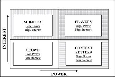 There are four quadrants in the Power-interest diagram: "Players" with a high degree of power e high degree of participation (interest) during the process; "Subjects" with high interest, but a low degree of influence over the decision; "Context Setters" with a high degree of power to perform future changes in the organization, however with low interest; and "Crowd" with a low degree of participation and low degree of influence on decision results. The sorting of quadrants is not statistical, it varies depending on the formal and informal relationships in the organization.