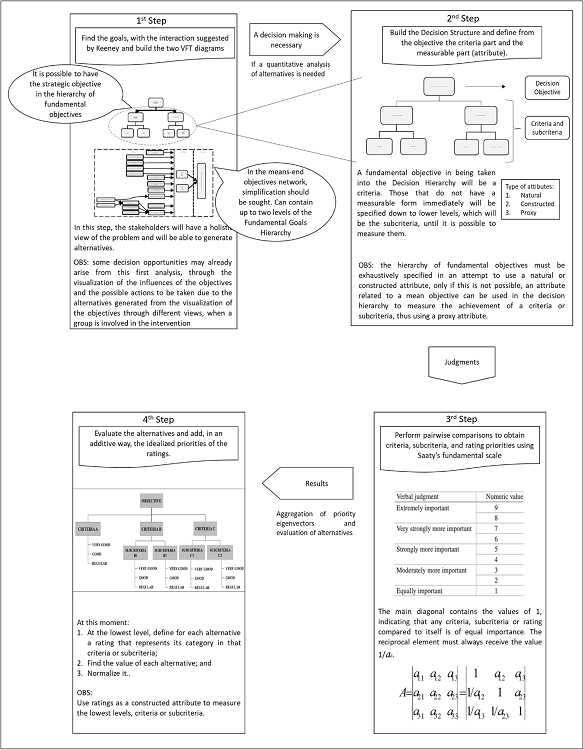 Therefore Figure 2 showed each step of the multimethodology proposed here to deal with the MCDA process, and it was depicted in each subsection. Summarizing the model: 1st) identify stakeholders; 2nd) structure the problem with Rich Picture and VFT; 3rd) make the transition from VFT to AHP as presented in Figure 2; 4th) apply all steps of AHP; and 5th) do the sensitivity analysis.