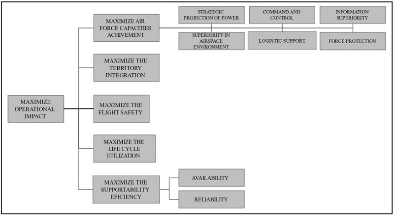 "Operational Impact" appear also on another strategic norm, the Aeronautics Systematic Planning and Institutional Management, as a criterion to start projects in Air Force: "impact straight in Force operationality, through the inter-relationship with Airspace Power Capacity" (Brasil, 2019, p. 30). Considering the attributes generation, the fundamental objective cited before was specified. "Maximize the Operational Impact" was specified (what does this objective mean?) in five more objectives, setting the second level of hierarchy. The process proceeded, stopping in the third level (Figure 7).