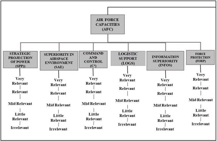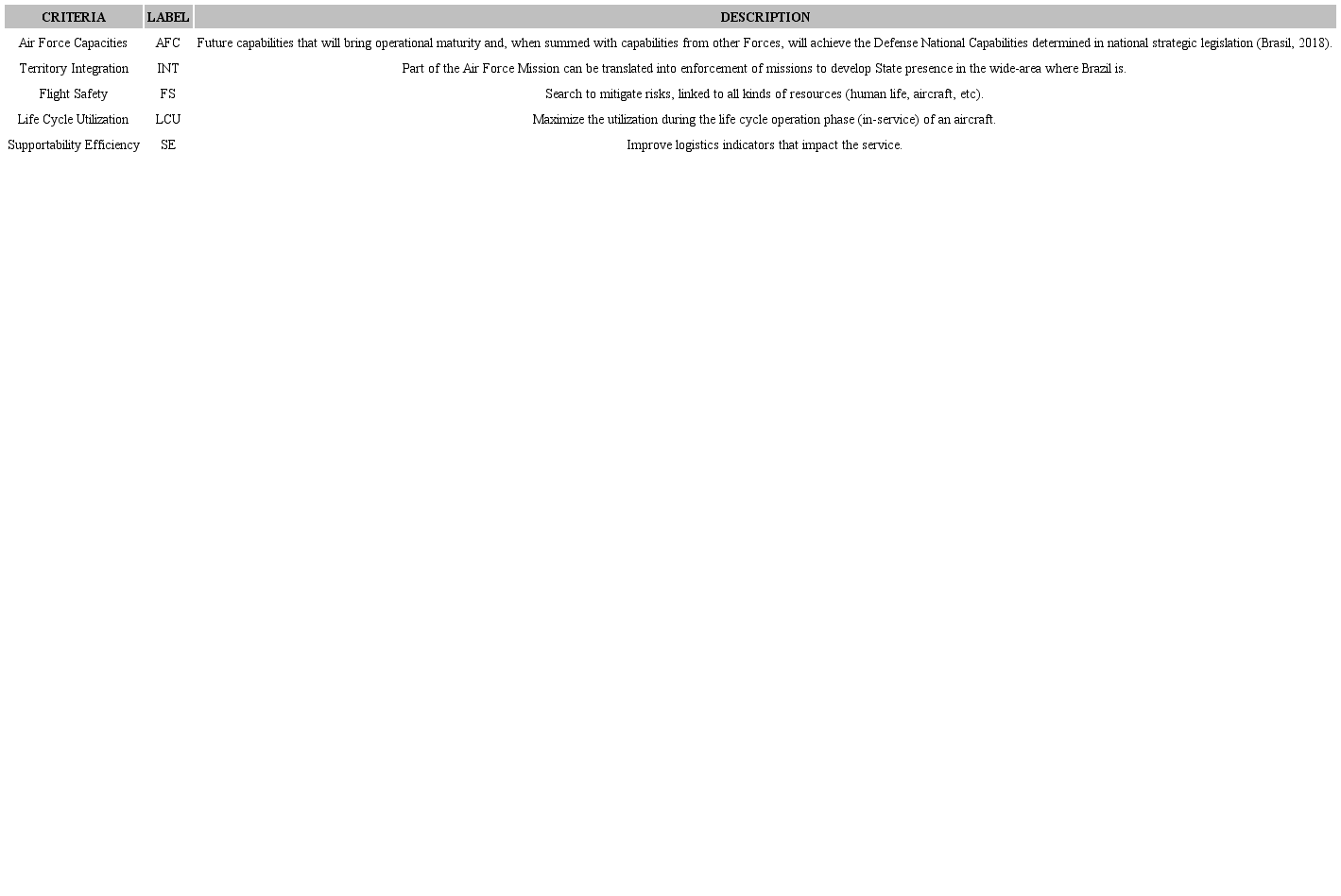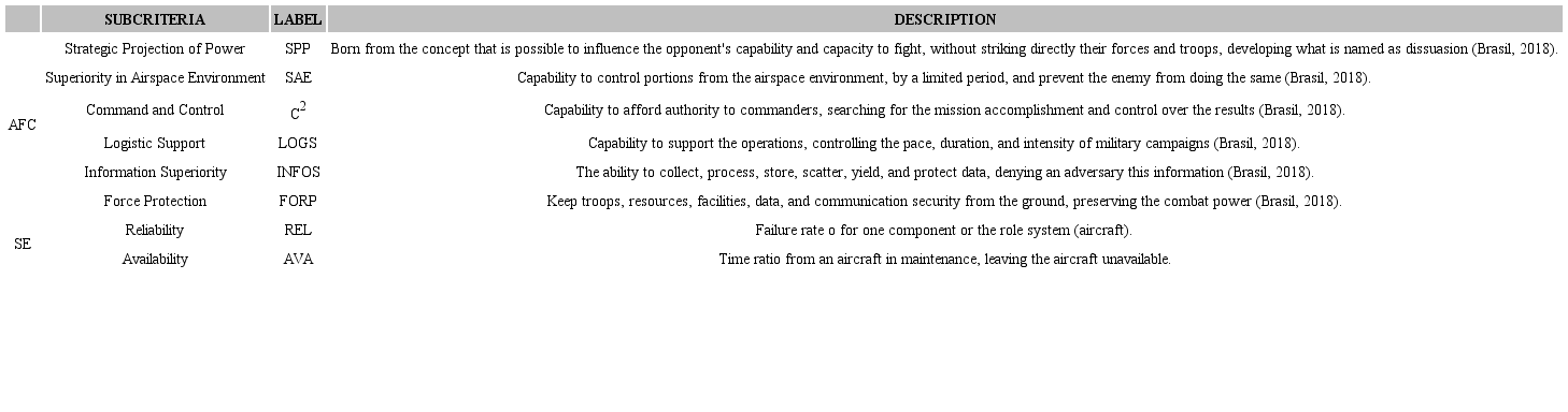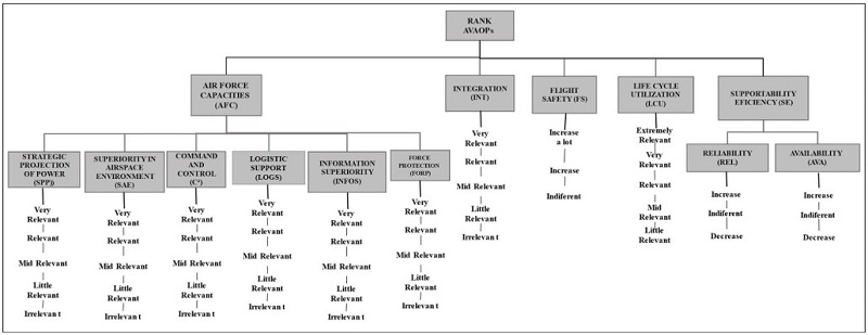The questionnaire used was based on Keeney (1996a). It also made a literature review of strategic legislation, with a bigger focus on DCA 11-45 (Strategic Conception of Air Force 100), because it is the newer strategic legislation and made significant changes in Brazilian Air Force. The workshops and legislation review yield twenty objectives, after taking out redundancy – redundancy is not a deficiency, it is much easier to recognize the desires and concerns when objectives are enumerated, with no restrictions, and although an objective, arising the most hidden interests (Keeney, 2013).