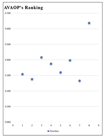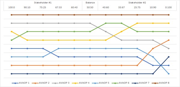 Considering that, in the case study, the three-best ranked AVAOPs would be implemented by the decision-maker, it is possible to see that the weight system may affect the final list. As implemented, both stakeholders' voice was balanced (50:50), therefore AVAOPs #8, #3, and #6 would be implemented.