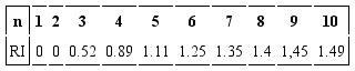 After calculating CI, it shall be compared with the Random Index (RI) – generated from aleatory matrices in 1-9 scale, with forced reciprocity, presented by Saaty (1994), when calculated to square matrices with n elements (Table 1). The Consistency Ratio (CR) is defined as CR=CI/RI. If CR is less than 0.1, it shows a consistent judgment process.