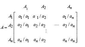 Pairwise comparison is illustrated by the matrix A, where A1, A2, and An are being compared: if the element a12 receives the value 3 from Fundamental Scale, meaning that A1 is moderately important if compared to A2, the element a21 receives 1/3.