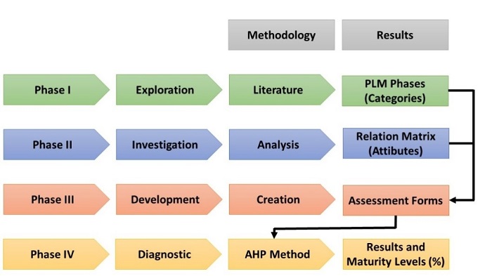 The paper is structured as follows. In section 2, a literature review was carried out with a view to comprehending the concepts in connection with PLM and Industry 4.0 maturity models. Section 3 enunciates the methodologies applied in classifying the phases of PLM, selection of Industry 4.0attributes, creation of assessment forms and application of the AHP method. The following section presents the results obtained in the diagnostic analysis and the resulting improvement proposals. The conclusion of this research is presented in section 5.