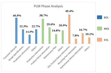 In the analysis of the MOL phase in PLM, the different categories received the following percentage values Product Status Information (39%), Product Information (37%) and Maintenance Plan (24%). The midlife phase is post-manufacture when the product has been distributed, used and repaired. In this phase, it is important to collect data about any form of failure, maintenance rates and user experience to obtain information for immediate solutions and future development. In the EOL phase of PLM, the categories received the following percentages Maintenance History Information (38%), Recycling Part Information (35%), and EOL Product Status Information (27%). The end-of-life phase is the removal of the product, recycling and disposal. This is when the reverse logistics takes place for the company. EOL starts when users no longer need the product. In this stage, companies collect information about which parts and materials still have value.