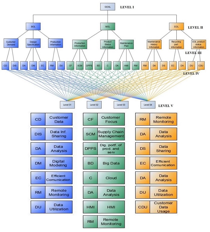 Level 2 – (Criteria) represent three macro phases of PLM (BOL, MOL, EOL);