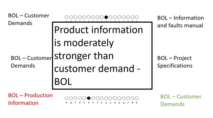 For the BOL Phase, the Product Information category received a percentage value of 41%.At this stage, product information has to be shared along the production chain, to be synchronized with future updates. Assembly instruction, production specifications, production history data, production plan, inventory status are all related to this phase. Categories Customer Demand and Design Specifications received percentages of 36% and 26% respectively.