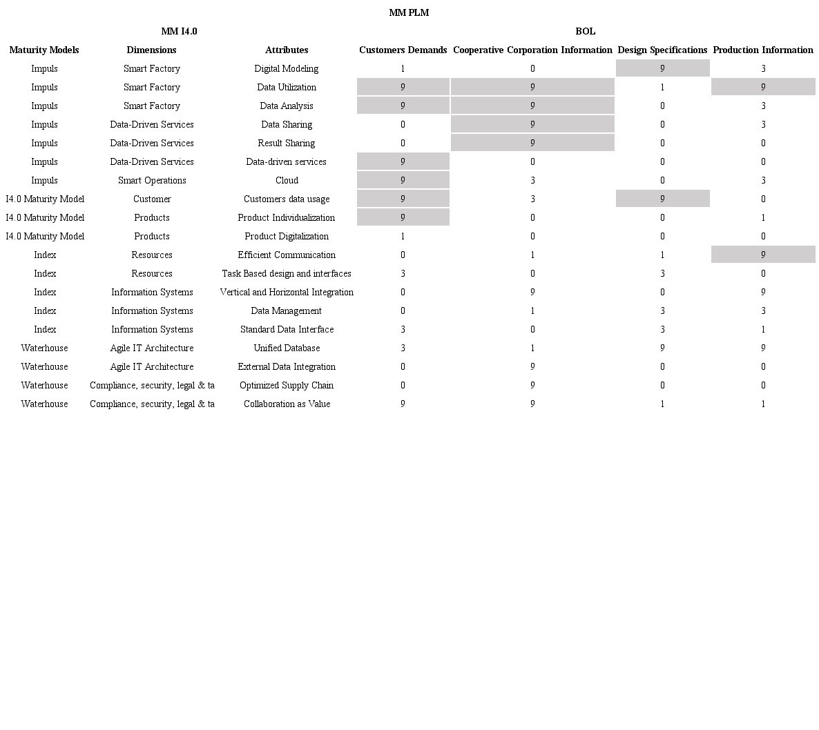 In this stage, a relational matrix was built with the objective of mapping the relations among the attributes of the Industry 4.0 Maturity Models (Impuls-VDMA, Industry 4.0 Maturity Model, Simmi 4.0, Index (Acatech), Industry 4.0 readiness (University of Warnick) and Gokalp Maturity Model under the categories of the BOL, MOL and EOL phases of PLM. These analyses will be used as an instrument of analysis to determine which attributes should be selected and used in development and diagnostic phase.