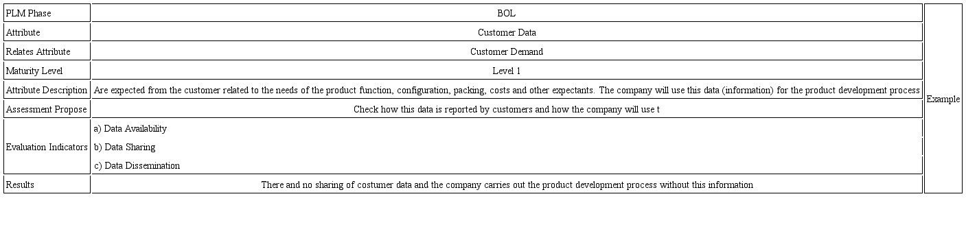 The forms are responsible for organizing information inherent to the maturity level correlated to the attributes. Four forms were drafted for attributes, representing the four levels of maturity. These structure information is in connection with: the PLM phase, attribute to be assessed, related attribute, level of maturity, description of the attribute proposed for assessment, indicators to be evaluated, results expected in that level. Table 3 shows an example of a structured form.