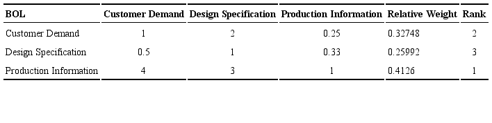 Based on the AHP structure, criteria and sub-criteria are subjected to pairwise comparison in a scale ranging from 1 to 9, the Saaty scale (Saaty, 2000). In this stage of the research, thirteen specialists involving different sectors of PLM in the company under study attributed weightings in the comparison among attributes. In Figure 4, a pairwise comparison illustrates the assessment related to “BOL Phase” layer of AHP structure. Grade 4 was assigned to “Production Information”, representing that is moderately important than “Customer Demand”.