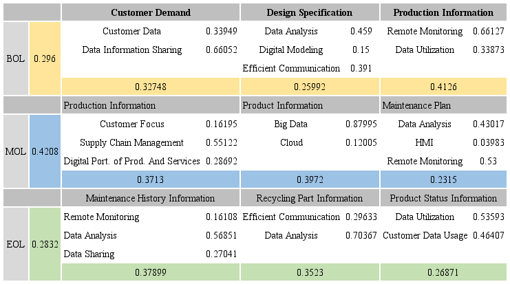 In the MOL phase, the most representative Industry 4.0 attributes are Supply Chain Management (55%)in category Production Information, which is the management of information for the entire logistics chain (covering logistic processes from the reception of customer orders all the way to the delivery of the product at its final destination), using as data the production information throughout the product lifecycle and Remote Monitoring (53%) which is the remote access to data in connection with maintenance and failure information preventive and predictive maintenance during the midterm of the product lifecycle. Attributes Customer Focus in phase MOL (16%) describing what is expected from the user manual and with requirements defined by customer needs, and Big Data (12%), large volumes of information and integration of any data collected on the status of the product in the middle of its lifecycle, have lower grades in the assessments and need to be improved.