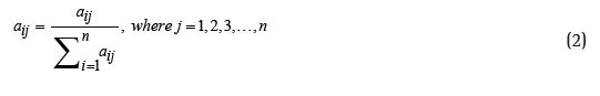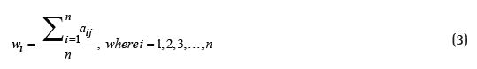 After normalizing the matrix, the Eigenvector must be calculated, which is a matrix not linked to magnitudes, given that it only contains the relative order of priority among the elements, with the objective of allocating weighting to the criteria. The equation for building the eigenvector (3).
