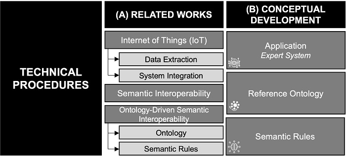 According to this context, Figure 1 summarises the technical research procedures adopted in this research. Detail “A” of Figure 1 shows the studied concepts used to support the development of the IDEIEs 4.0 architecture. In Detail, “B” of Figure 1 categorises the main functions necessary to overcome the problem.