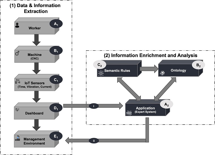Application (Detail “A2” of Figure 2) – the system’s application depicted is an expert system that is responsible for instantiating the data in the ontology and analysing the results of the inference engine according to the semantic Rules Application. The results allow the application to check if there are any inconsistencies in the inferences. But, if there is any inconsistency that cannot be automatically corrected, the management environment must contact the responsible for the machine to correct it manually. After the application of the inference engine on the ontology, the generated knowledge will be sent back to the Management Environment (Detail “ii” of Figure 2), which will analyse and take necessary actions for the manufacturing process (Detail “E1” of Figure 2);