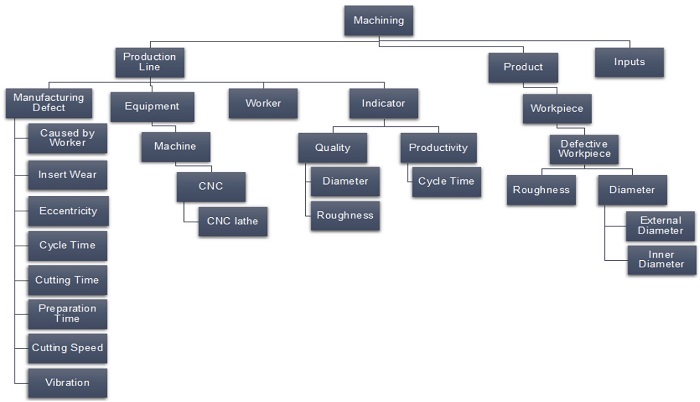 The Equipment subclass encompasses the equipment used in the production line of the machining process. This subclass consists of a milling machine by Computer Numerical Control and a CNC Lathe machine. The subclass Indicator is divided into Productivity Indicator (which has the Cycle Time subclass) and Quality (unfolding in Diameter and Roughness), considering that these are the parameters used to evaluate the machining quality and productivity. The worker subclass does not encompass any divisions.