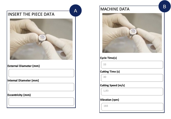 The data displayed about the piece are internal diameter, external diameter and eccentricity, shown in Figure 8 (Detail “A”). The data presented about defects are the machine cycle and cutting time, cutting speed and vibration, as shown in Figure 8 (Detail “B”). Additionally, the weekly displayed data are the inserted wear, the number of parts produced, machine operation time, the number of problems reported, and the roughness of the samples collected.