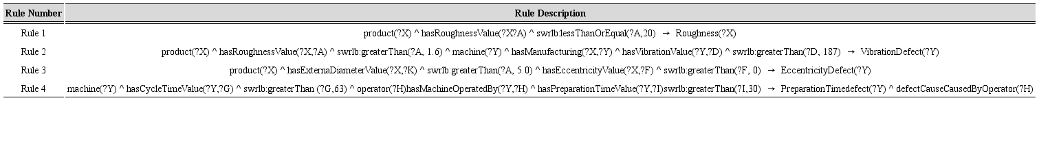 Table 1 illustrates the semantic rules used in this experimental case. If true, all the information preceding the arrow symbol () in the body makes the following information also true and inferred. So, Rule 4 in the Table can be read as “If the machine “Y” has a cycle time value of “G”, and if “G” is greater than 63, and if the machine “Y” is operated by a worker “H”, and the machine “Y” has a preparation time value “I”, and if “I” is greater than 30, it means and is also inferred, that the machine “Y” has a defect of preparation time, and the worker “H” caused the defect.