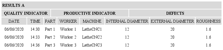 Based on these questions, Table 2 presents the manufactured parts’ quality that is measured by the inner diameter, outer diameter, and roughness values. The defects of the piece are measured with multiple parameters, as shown in Table 3. The parameters are (i) defects caused by the operator, (ii) defects caused by insert wear, defects in eccentricity, (iii) defects in a cycle and cutting time, (iv) defects in preparation time and (v) defect in vibration. These data are displayed together with the date and the time of production, the operator's name, the piece number and the machine number, and they are inferred by applying an inference engine through the semantic rules.