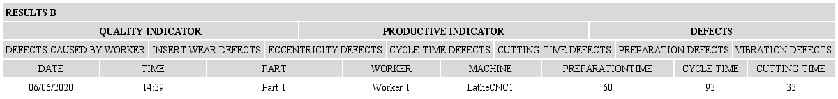 The cycle time is used to analyse the productivity indicator, which means that if it is greater than 63 seconds, a problem that occurred during the machining could be caused by the operator or by the preparation time (cannot be greater than 30 seconds), or by the cutting time that has a maximum acceptable value of 33 seconds.