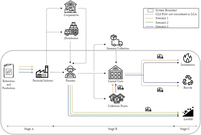 None of the studies described above focus on quantification of the potential benefits brought by the implementation of a national policy for reverse logistic of empty pesticide containers used for crop protection in Brazil. The use of plastics in agriculture is rarely addressed in rural waste management research and is an important component for the promotion of sustainable practices in agriculture (Altieri, 2018). The assessment of environmental impacts associated with national waste management practices, may consolidate the advantages brought by the PNRS. This can also be relevant for identifying options for improvements within the Brazilian current RL activities for EPPC. For the purpose of quantifying the environmental impacts, a LCA study of EPPC RL for the current practices within the state of São Paulo (Brazil), including the situations pre–CLS and post-CLS, was carried out. The boundaries considered include the container material production, manufacturing and transportation from the collection points until the valorisation/deposition sites (recycling, incineration and landfill).