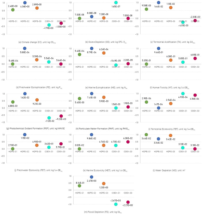 The impact categories for the three scenarios (S1 to S3) were evaluated for the two materials (HDPE and COEX) used as EPPC as shown in Figure 2. The figure presents results normalized from -1 to 1 within each impact category for all scenarios assessed. Results show that the worse environmental impact results are found for S2 in which all containers are produced from virgin HDPE and are sent off to landfills. This scenario contributes the most for 11 of the 13 categories analyzed. In contrast, S1 shows a better environmental contribution when containers are made of COEX. Negative values show reduced environmental burdens due to the positive effect of using recycled material in container production.