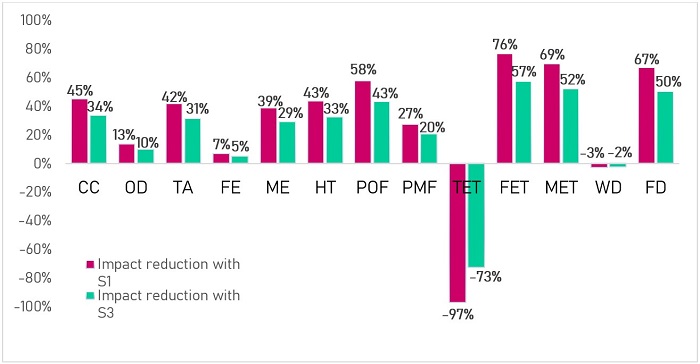 Results for S1 indicate EPPC incineration to be the larger contributor for environmental impacts while for S3 it is landfills. This is because the amount of landfilled containers is comparatively larger in S3 when compared to Scenario 1. In S1, 6% of the overall containers are landfilled while in Scenario 3 the value is 31%. Still comparing HDPE scenarios 1 and 3, both had significant gains when compared to S2. Figure 3 shows the reduction in impact categories post-CLS for S1 and S3, values are relative to the situation pre-CLS or S2. The calculated values show the relative change resulting from S1 and S3 when compared to the impacts from the situation prior to the CLS (S2). Positive values indicate relative reduction in potential impacts and negative values indicate potential increase in impacts in comparison with S2. From the 13 categories analyzed, 11 of them had reduced environmental impacts with the use of RL brought by the CLS.
