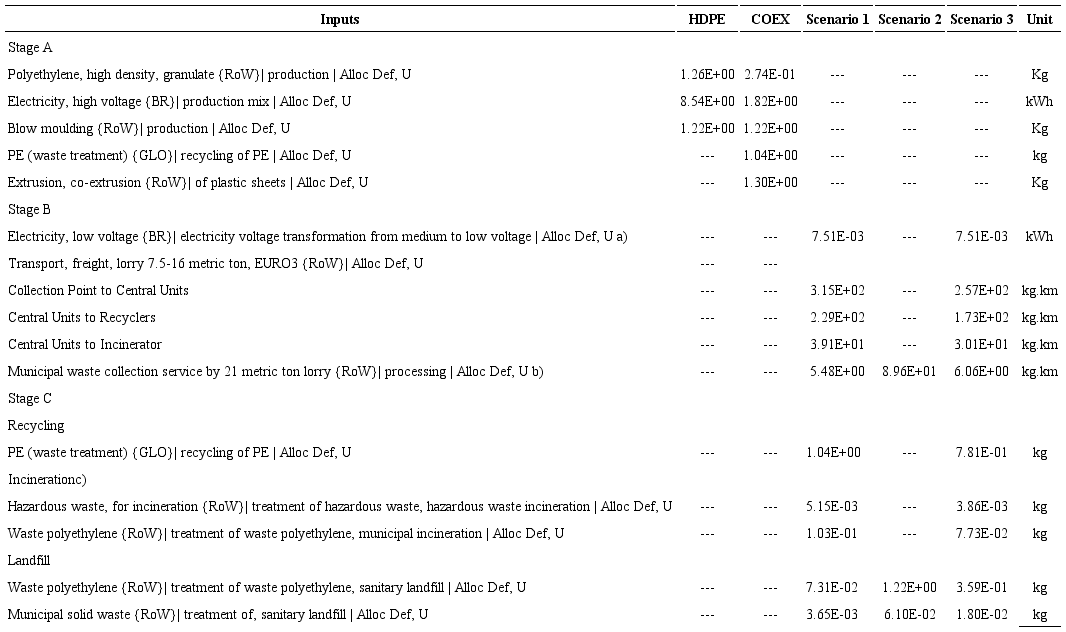 All scenarios consider the extraction of HDPE and the production of the container by blow molding. For COEX, 80% (mass) comes from the recycling of EPPC made from HDPE and the remaining comes from extracted raw material and it is manufactured with the processes of co-extrusion and blow molding (Oliveira et al., 2011). In Brazil, the collection of previously separated empty containers is made by type of packaging material, making use of big bags and using heavy trucks. Upon completion of the full volume of a heavy truck these are sent to the central unit. At the central unit, containers are compacted and sent off for recycling or incineration. This work considers the data provided by InpEV that 94% of the EPPC returned to the system, from which 91% are recycled and 9% are incinerated (Instituto Nacional de Processamento de Embalagens Vazias, 2018). Packages not integrated into the CLS (remaining 6%) were considered to be sent to municipal solid waste (MSW) landfills by trucks in accordance with the standard end of life practices for plastic materials (Al-Salem et al., 2009; Lazarevic et al., 2010).