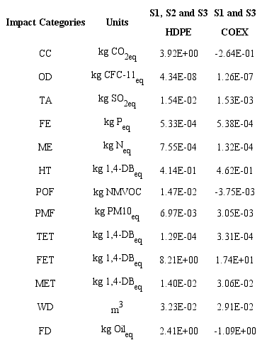 Stage A assesses the production of EPPC. When it is made out of COEX (contains 80% recycled material) the impact is smaller when compared to the production of HDPE (Table 2). The categories CC, POF and FD appear to be negative with COEX in Scenarios 1 and 3 because recycled material avoids the usage of fossil raw materials that play a major role in the manufacturing of plastics. The contribution of HDPE, is higher in 8 categories. In this analysis, the manufacturing process for COEX expends slightly more energy than that of HDPE, however it is offset by the reduction in energy spent for raw material extraction.
