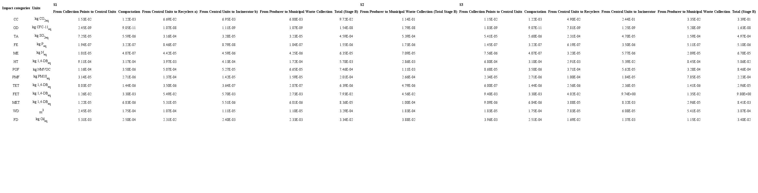 Stage B comprehends transportation but also includes the compaction of EPPC in the central unit. In scenarios 1 and 3 most of the EPPC is sent to recycling and, as expected, this path represents the largest impact due to transportation (Table 3). The largest contributors, in the two scenarios evaluated, are the central units in Paraguaçu Paulista and Bilac. Paraguaçu Paulista processes the largest volume of EPPC and is 500 km away from incinerators and recyclers, which made this central unit responsible for about 18% of total impacts on each of the routes. On the other hand, central units that contribute less to impacts are those that require less transportation and the amount of EPPC processed is among the smallest (as observed in Table SM3 to Table SM6).