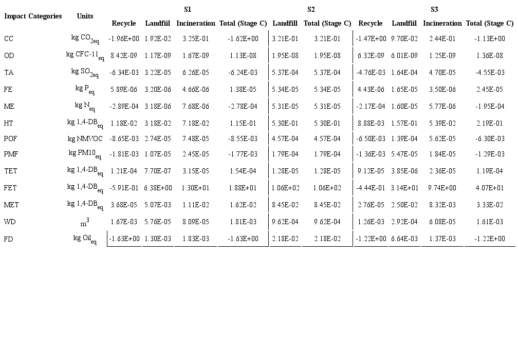 From Table 4 it is shown that for Stage C recycling is the EoL option with the lowest environmental impact, while incineration shows the worse contribution for S1 and landfill for S3. Results show that the recycling or incineration of EPPC (S1 and S3) have contributed to the reduction of generated impacts when compared to S2. As expected, when possible, recycling is the best end-of-life destination. For S1, some of the impact categories present negative values (namely, CC, TA, ME, POF, PMF, FET and FD) representing reduced impacts due to the recycling of plastic within the production chain.