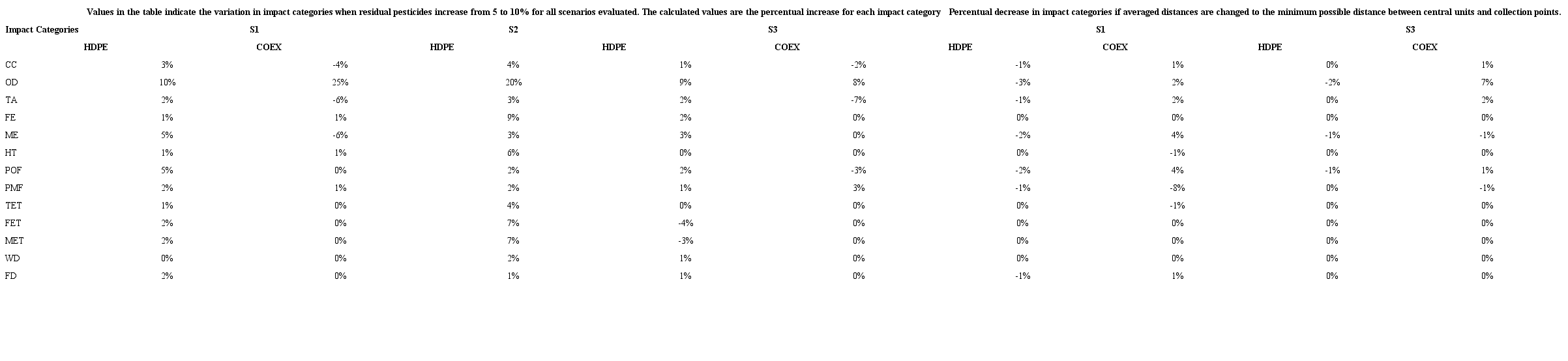 Results from the sensitivity analysis, presented in Table 5, shows a small variation in most of the impact categories assessed when the volume of residual pesticide in the container increases from 5% to 10%. A difference of more than 10% is found in S1 and S2 for both materials in one category, ozone depletion. Sensitivity analysis results considering the shortest distance travelled between central units and collection points for EPPCs showed changes below 7% for all impact categories.